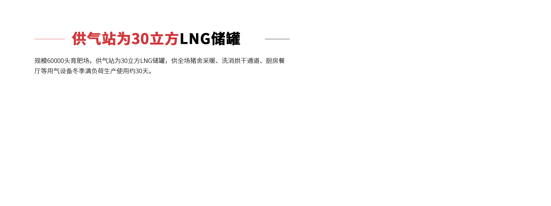 規模60000頭育肥場,供氣站為30立方LNG儲罐,供全場豬舍采暖、洗消烘干通道、廚房餐廳等用氣設備冬季滿負荷生產使用約30天。