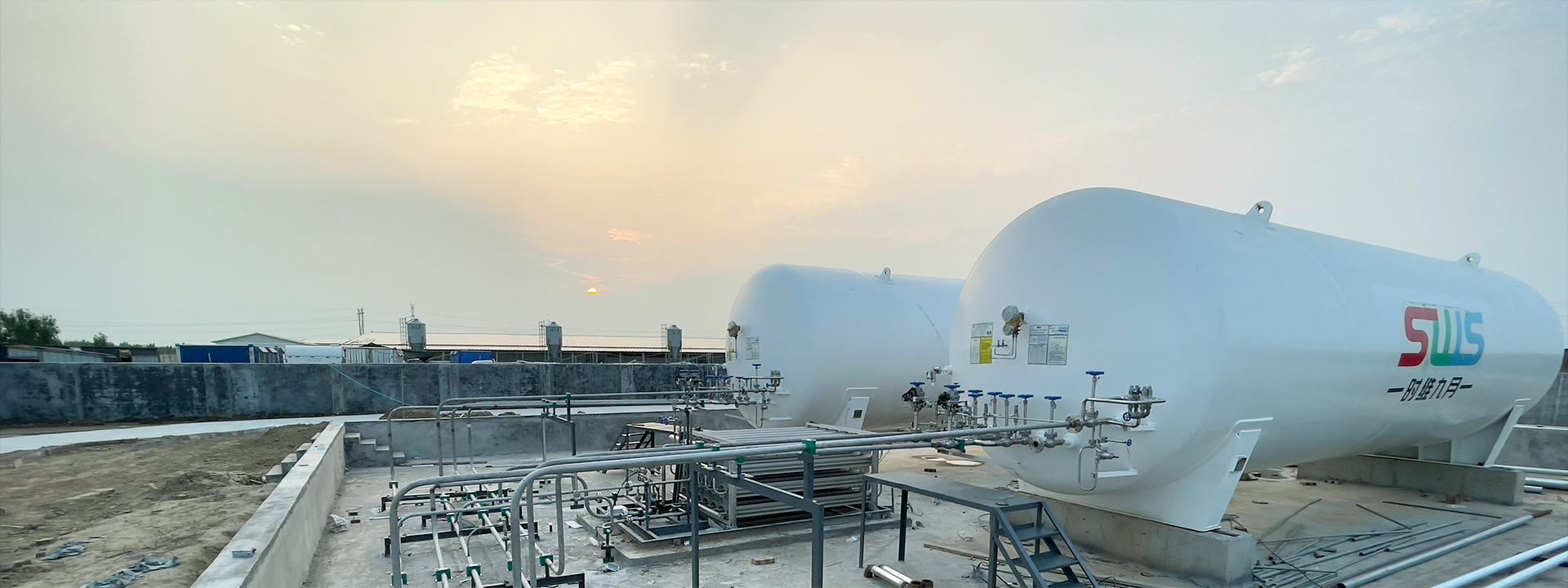 規模24000頭母豬場,供氣站為2*60立方LNG儲罐,供全場豬舍采暖、洗消烘干通道、高壓沖洗、廚房餐廳等用氣設備冬季滿負荷生產使用約15天。